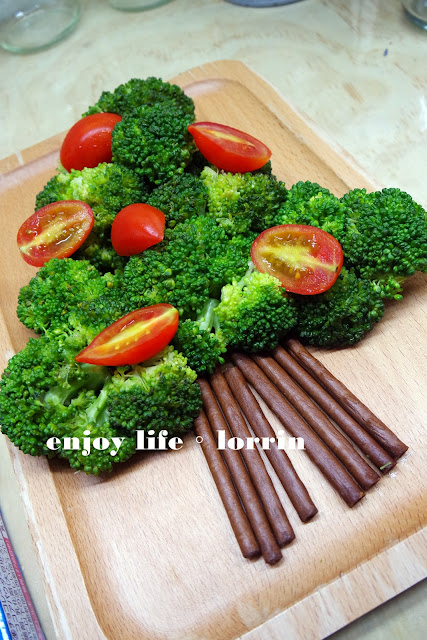 花椰菜用橄欖油蒸好擺盤,小蕃茄切半當裝飾